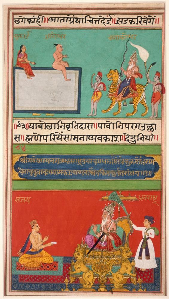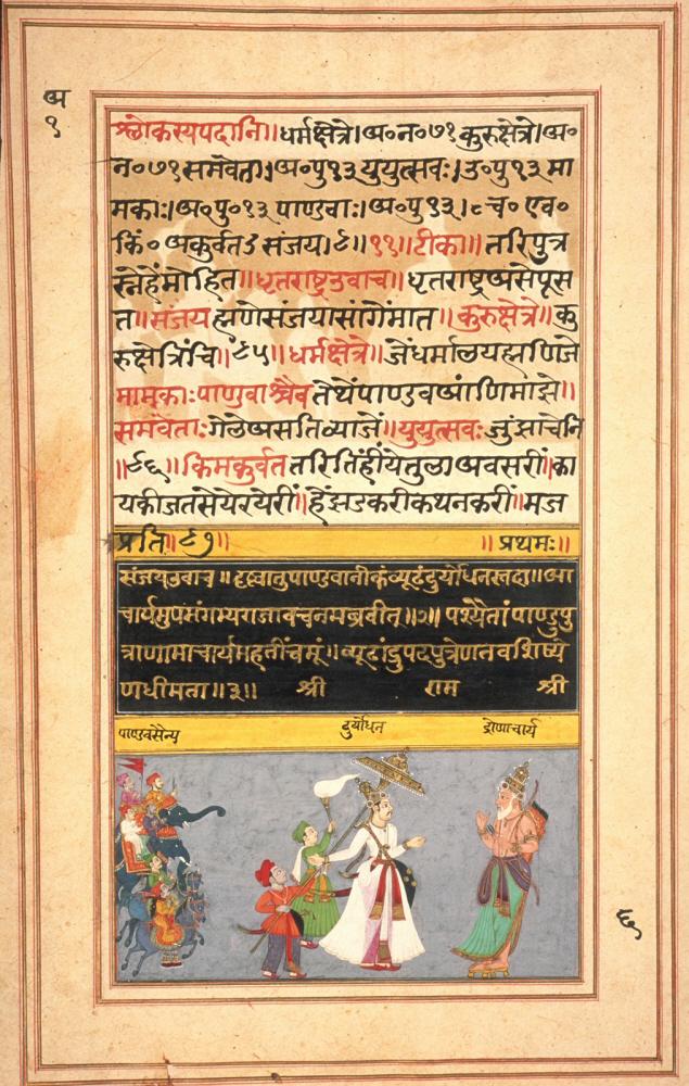 Notice the details in the illustrated folio of Dnyaneshwari represented above. The Sanskrit text of the Gita appears with its commentary in Marathi. This text is further supplemented by illustrations of the characters in discussion. As a means to remind the reader/listener of the work by a saint, some hagiographic details such as the episode of Dnyaneshwar meeting Changdev is illustrated in the text. In some sense, the manuscripts produced or commissioned as a commemorative piece of history (c. 8th century would be considered old by people in c. 1700 CE) present a deeper understanding of the impact and influence of the Bhakti movement .